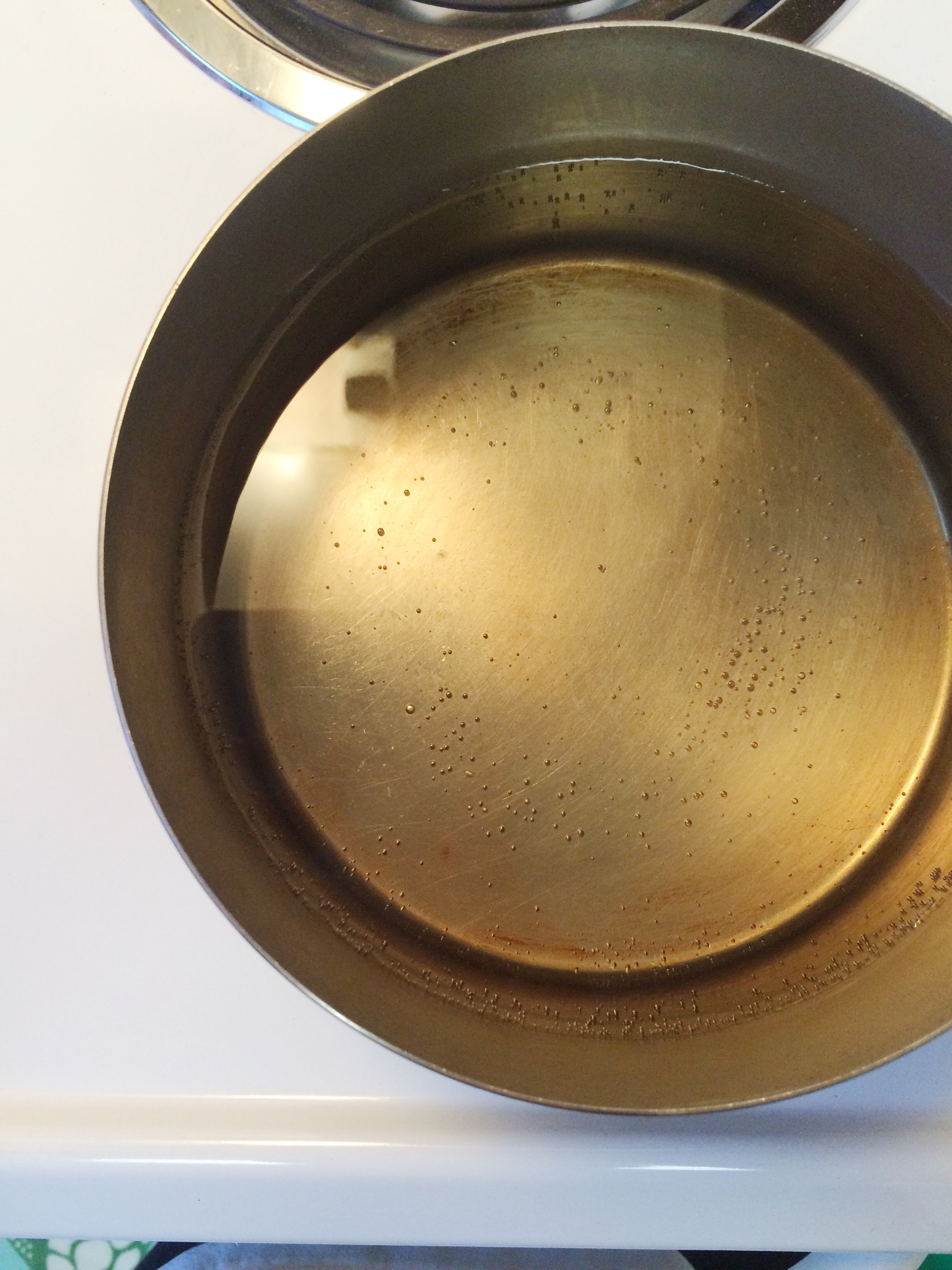 - Place the pot on the stove over medium heat. Heat the water until it is slightly below a simmer. We don’t want the egg jumping around in the pot, we want it to sit there quietly. Small bubbles will form on the bottom of the pot and maybe every so often they will float to the surface. But not so often that we are at a simmer. Okay? Okay.